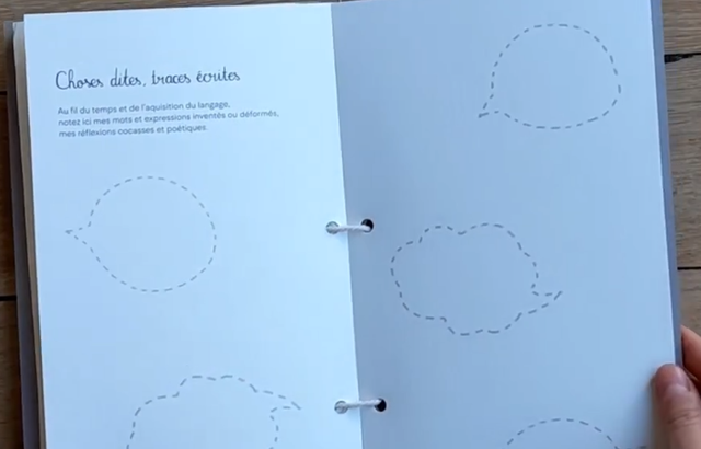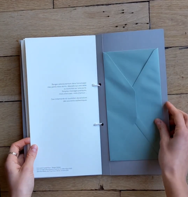 Une double page permet de garder une trace écrite des mots d’enfants et une enveloppe en 3ème de couverture accueille les petits mots que nos enfants nous laissent.
