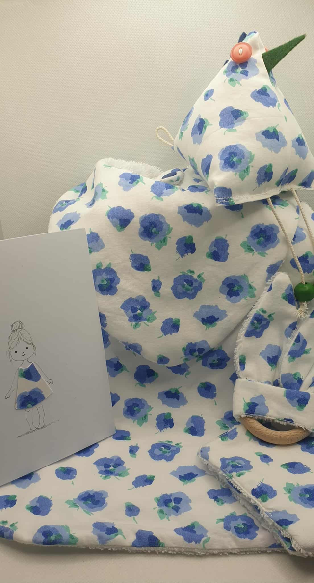 Ensemble de naissance en tissu Oeko-tex, doublé éponge " Câlin" Composé de : Deux bavoirs ( 1 bandana 0- 6 mois et 1 grand 6- 18 mois Quatre lingettes lavables Un anneau de dentition ( éponge bambou) Une poulette décorative Une carte assortie